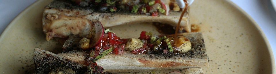 Angel Vázquez en Intro (Calzada Zavaleta 5240) Puebla, hace elaboraciones mucho más encumbradas con sus tuétanos, los cuales entrega para untarse en pan, cortejados por ensaladilla.